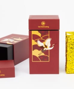 Hộp Trà Hồng Phúc màu đỏ mang hoạ tiết đơn giản mà sang trọng.
